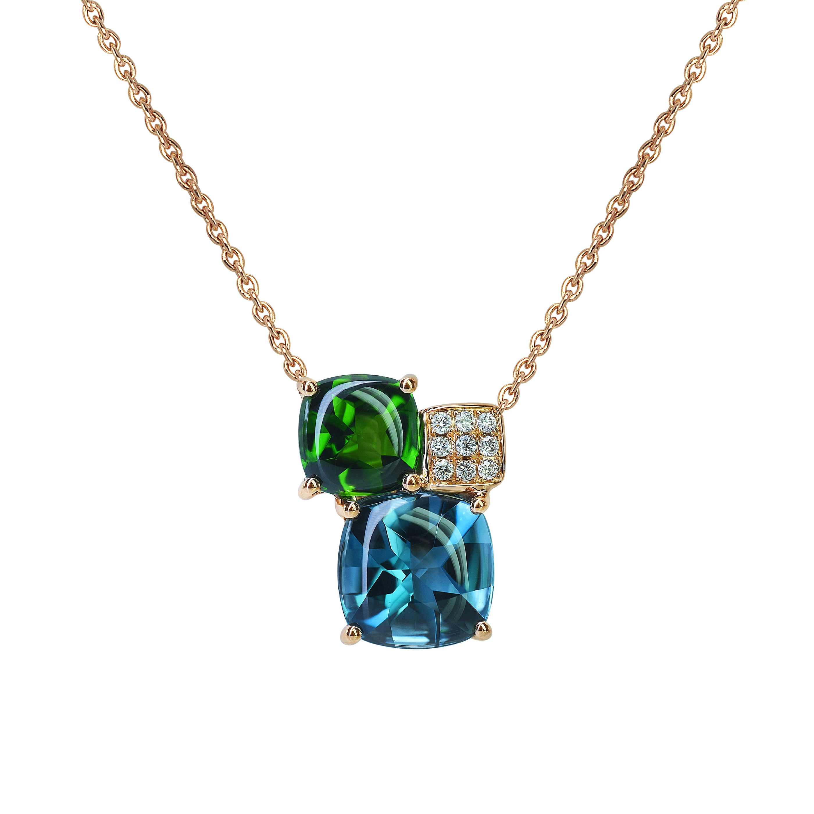 A partir de 3 300€Collier Pavés de Paris Topaze bleu London, Diopside, Diamant - 18kRef : N416Chaîne : Or Rose 18kPierres :Topaze bleu London, Diopside, Diamants.