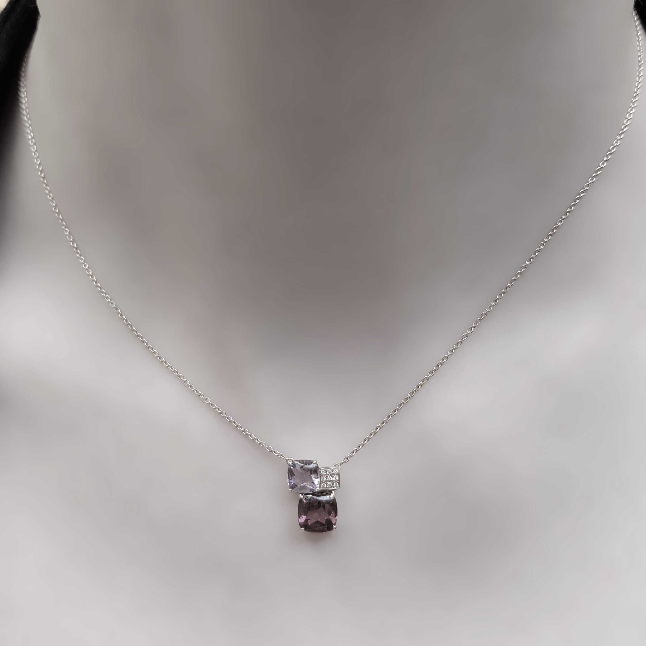 A partir de 5 450€Pendentif Pavés de Paris - Pierre de Lune Or Blanc 18kRef : P431Monture : Or Blanc 18kPierres :Iolites, Rose de France, Quartz rose, Diamants.