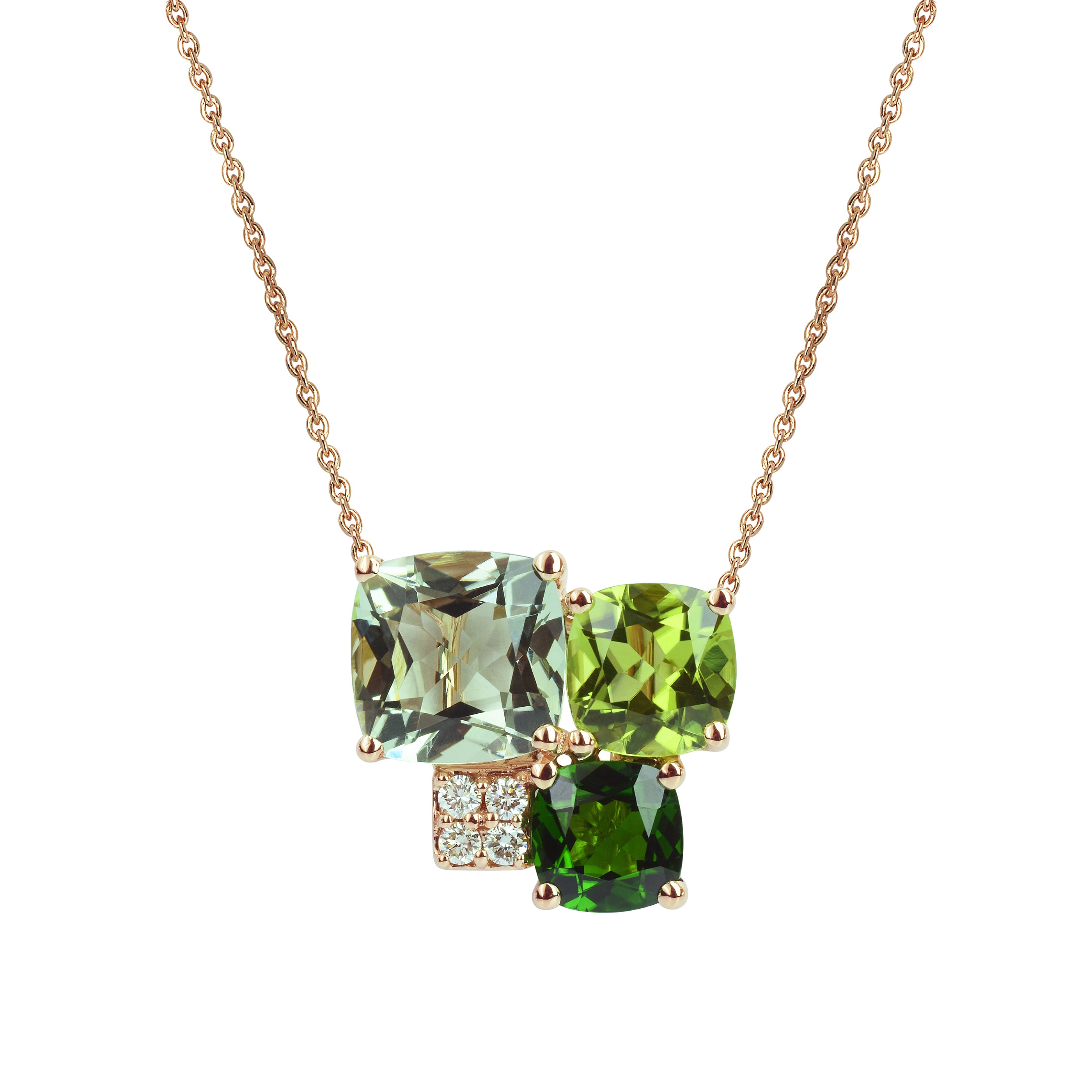 A partir de 6 650€Collier Pavés de Paris - Quartz vert, Péridot, Diopside, DiamantN502Chaîne : Or Rose 18kPierres :Quartz vert, Péridot, Diopside, Diamants.