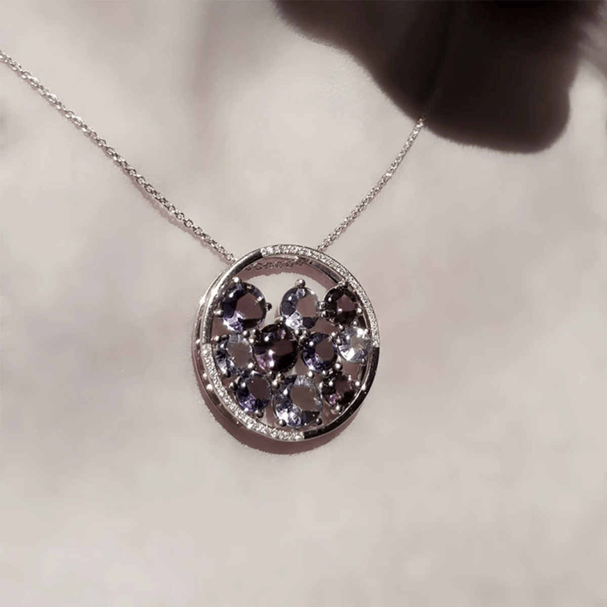 A partir de 2 100€Pendentif Sac de Billes - Bleu, Violet & Vert Or Rose 18kRef : P721Monture : Or Rose 18kPierres :Topazes bleu "Swiss Blue", Cordiérites, Amethystes, Tsavorites.