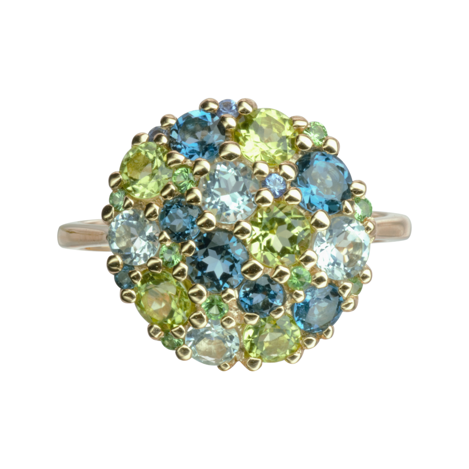Bague Pointilliste - Péridots et Topazes bleus Or Jaune 18kRef : R410BMonture : Or Jaune 18kPierres :Topazes bleus, Topazes London Blue, Péridots, Tsavorites, Saphirs.