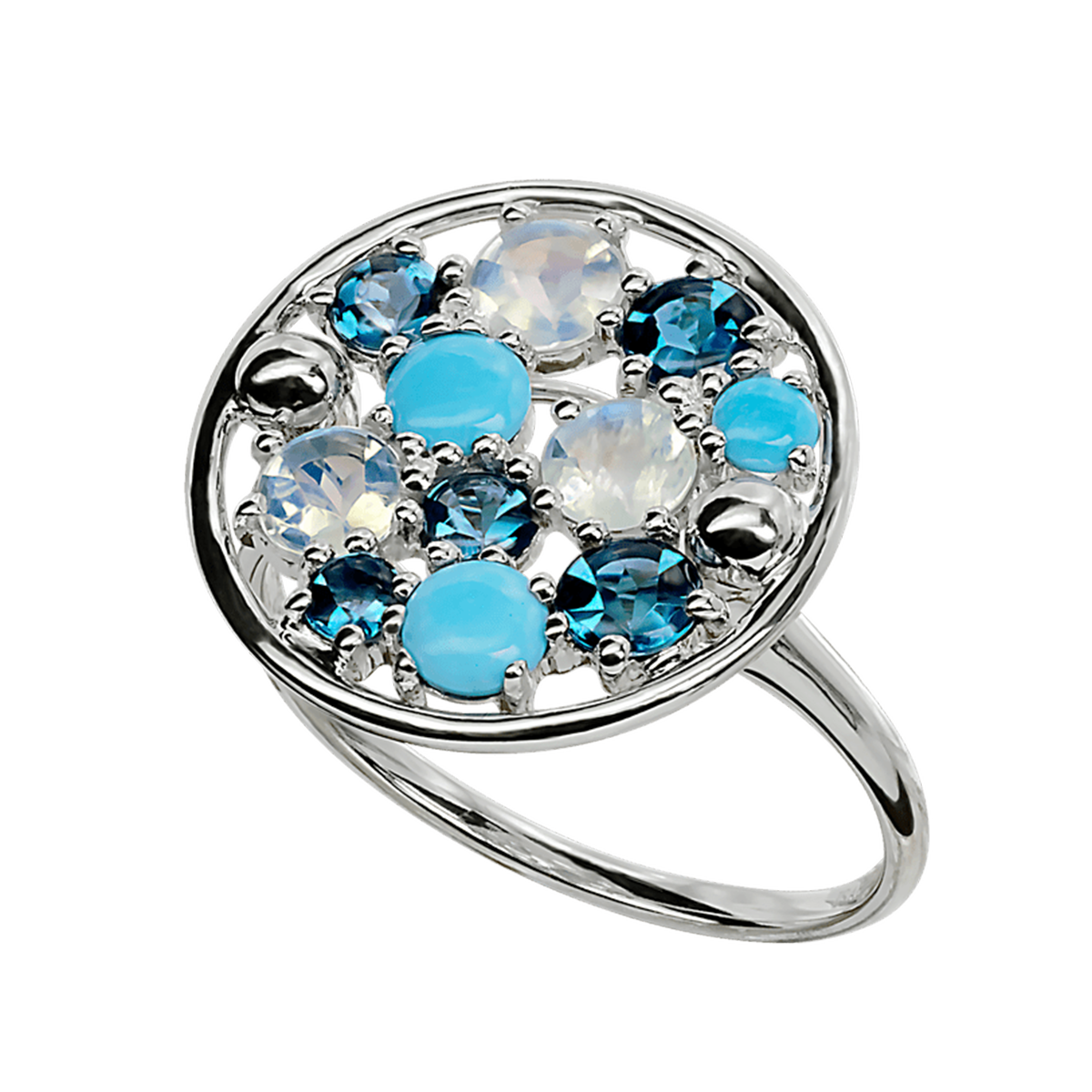Bague Sac de Billes - Or Blanc 18kRef : R1530Monture : Or Blanc 18kPierres :Turquoises, Topazes London Blue, Pierre de Lune.